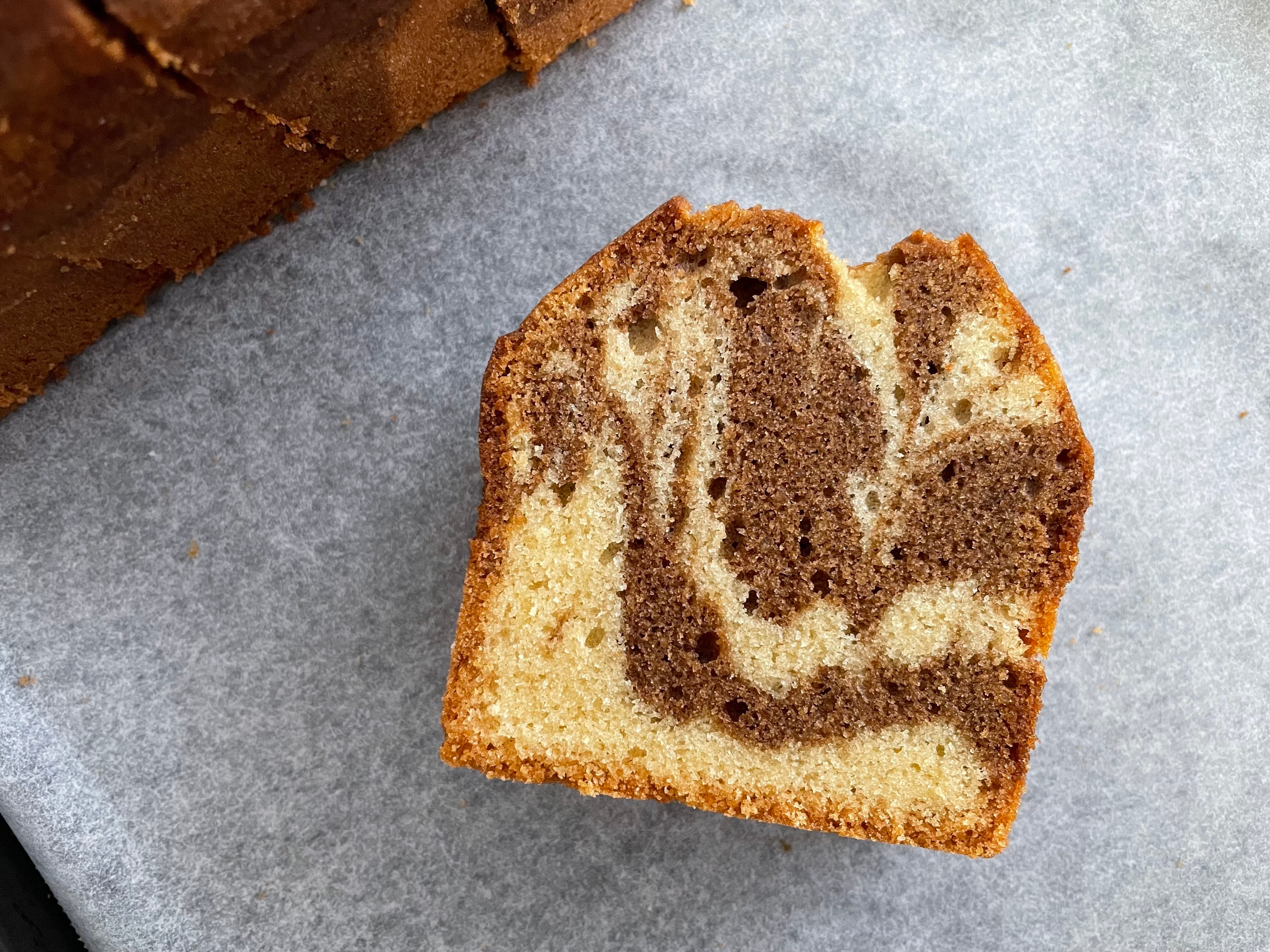 ほんのりビターなコーヒー生地にまろやかさを出すため少しチョコを加えた、やさしい味わいのカフェオレマーブルのお米ケイク。